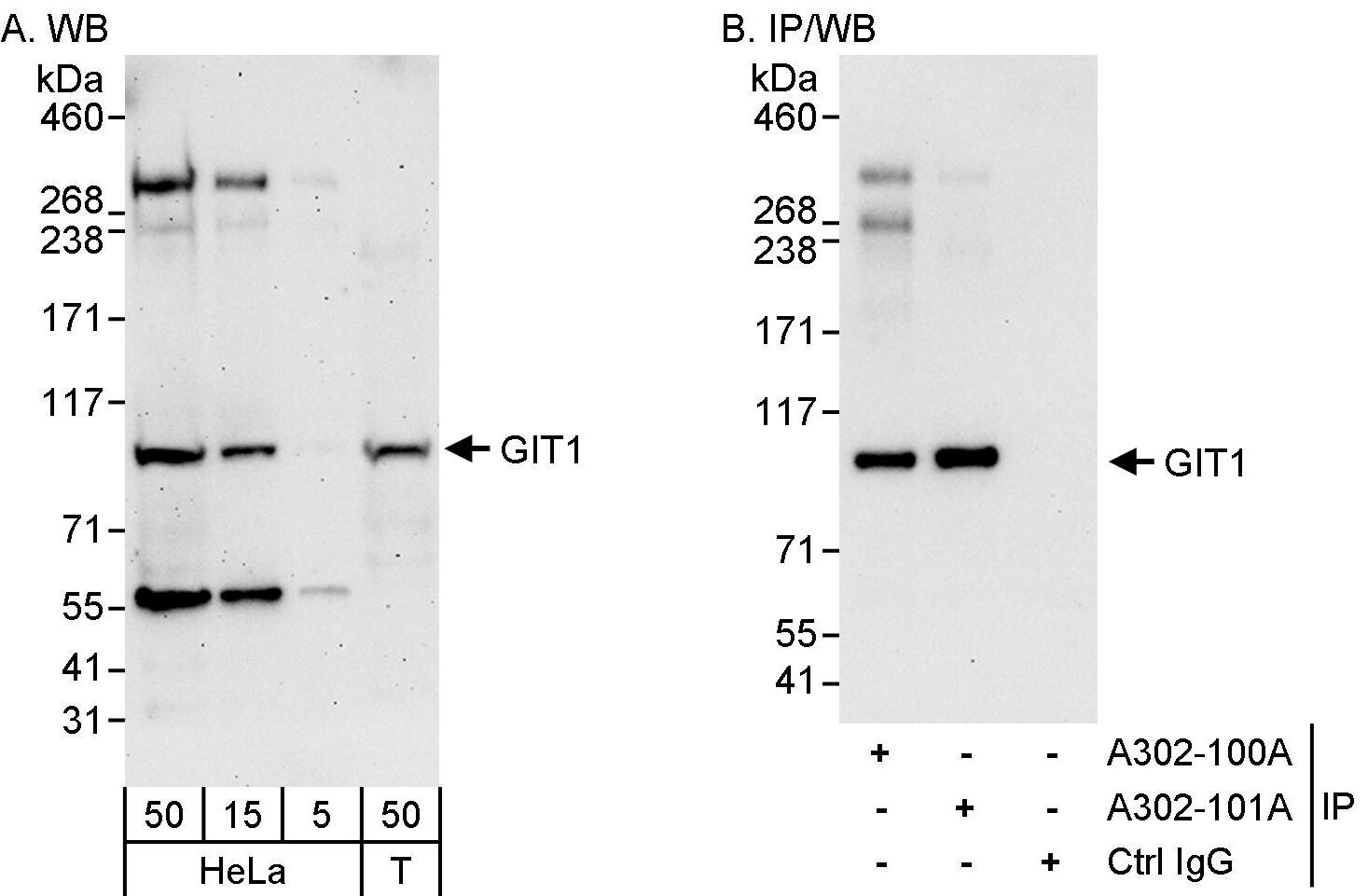 - Detection of human GIT1 by western blot and immunoprecipitation. Samples: Whole cell lysate from HeLa (5, 15 and 50 µg for WB; 1 mg for IP, 20% of IP loaded) and 293T (T; 50 µg) cells. Antibodies: Affinity purified rabbit anti-GIT1 antibody A302-100A used for WB at 0.04 µg/ml (A) and 0.4 µg/ml (B) and used for IP at 3 µg/mg lysate. GIT1 was also immunoprecipitated by rabbit anti-GIT1 antibody A302-101A, which recognizes a downstream epitope. Detection: Chemiluminescence with exposure times of 3 minutes (A) and 30 seconds (B).