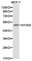 - Western blot analysis of MCF-7 cell lysate using ATXN3 antibody.
