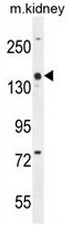 - COBL Antibody (N-term) western blot analysis in mouse kidney tissue lysates (35ug/lane).This demonstrates the COBL antibody detected the COBL protein (arrow).