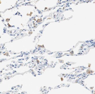 - Immunohistochemistry-Paraffin: actin-related protein 2/3 complex subunit 1B Antibody [NBP1-90114] - Staining of human lung shows weak cytoplasmic positivity in macrophages.