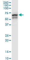 - Western Blot analysis of CCT7 expression in transfected 293T cell line by CCT7 monoclonal antibody (M01), clone 1D6.Lane 1: CCT7 transfected lysate(59.4 KDa).Lane 2: Non-transfected lysate.