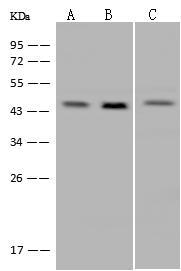 - Anti-GPN1 rabbit polyclonal antibody at 1:500 dilution. Lane A: HL-60 Whole Cell Lysate. Lane B: HeLa Whole Cell Lysate. Lane C: U-251 MG Whole Cell Lysate. Lysates/proteins at 30 ug per lane. Secondary: Goat Anti-Rabbit IgG (H+L)/HRP at 1/10000 dilution. Developed using the ECL technique. Performed under reducing conditions. Predicted band size: 42 kDa. Observed band size: 44 kDa.