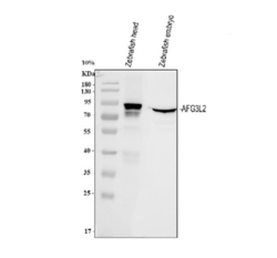 - Western blot analysis of Zebrafish Afg3l2 protein using Zebrafish Afg3l2 antibody and 1) zebrafish head and 2) zebrafish embryo tissue lysate. Predicted molecular weight ~89 kDa.