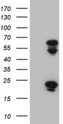 - HEK293T cells were transfected with the pCMV6-ENTRY control (Left lane) or pCMV6-ENTRY TRMT12 (RC203982, Right lane) cDNA for 48 hrs and lysed. Equivalent amounts of cell lysates (5 µg per lane) were separated by SDS-PAGE and immunoblotted with anti-TRMT1. Positive lysates LY402634 (100 µg) and LC402634 (20 µg) can be purchased separately from OriGene.