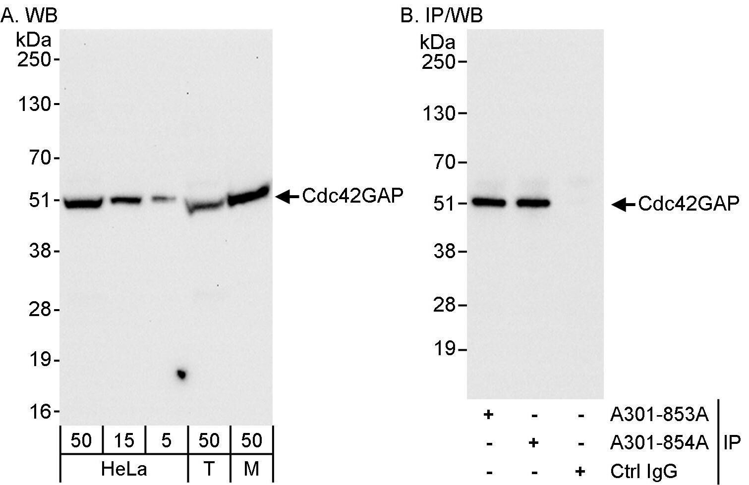 - Detection of human and mouse Cdc42GAP by western blot (h&m) and immunoprecipitation (h). Samples: Whole cell lysate from HeLa (5, 15 and 50 µg for WB; 1 mg for IP, 20% of IP loaded), 293T (T; 50 µg), and mouse NIH3T3 (M; 50 µg) cells. Antibodies: Affinity purified rabbit anti-Cdc42GAP antibody A301-853A used for WB at 0.04 µg/ml (A) and 0.4 µg/ml (B) and used for IP at 3 µg/mg lysate. Cdc42GAP was also immunoprecipitated by rabbit anti-Cdc42GAP antibody A301-854A, which recognizes a downstream epitope. Detection: Chemiluminescence with exposure times of 10 seconds (A) and 1 second (B).