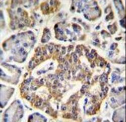 - GRIN2A Antibody immunohistochemistry of formalin-fixed and paraffin-embedded human pancreas tissue followed by peroxidase-conjugated secondary antibody and DAB staining.