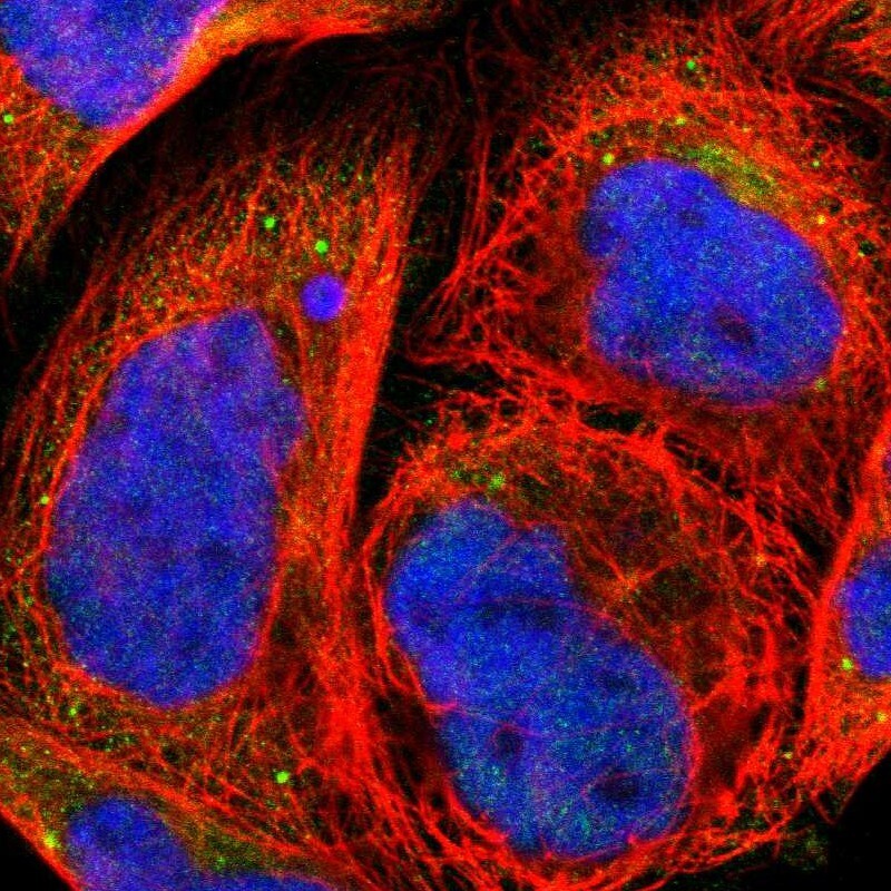 - Immunofluorescent staining of human cell line A-431 shows localization to endoplasmic reticulum & lysosomes.