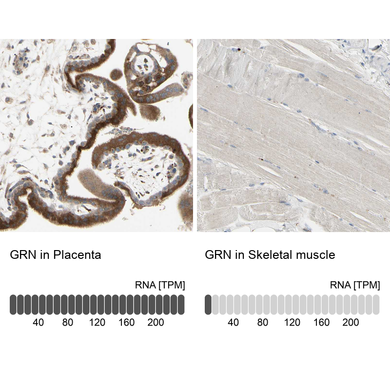 - Immunohistochemistry analysis in human placenta and skeletal muscle tissues using HPA008763 antibody. Corresponding GRN RNA-seq data are presented for the same tissues.