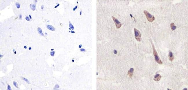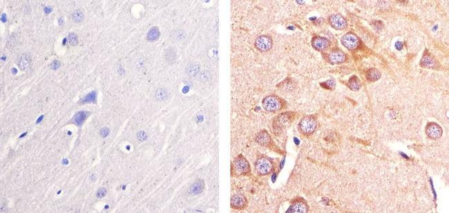 - Immunohistochemistry analysis of Pannexin 2 showing staining in the cytoplasm of paraffin-embedded human brain tissue (right) compared to a negative control without primary antibody (left). To expose target proteins, antigen retrieval was performed using 10mM sodium citrate (pH 6.0), microwaved for 8-15 min. Following antigen retrieval, tissues were blocked in 3% H2O2-methanol for 15 min at room temperature, washed with ddH2O and PBS, and then probed with a Anti- Pannexin 2 Polyclonal Antibody (Product # 42-2900) diluted in 3% BSA-PBS at a dilution of 1:100 overnight at 4ºC in a humidified chamber. Tissues were washed extensively in PBST and detection was performed using an HRP-conjugated secondary antibody followed by colorimetric detection using a DAB kit. Tissues were counterstained with hematoxylin and dehydrated with ethanol and xylene to prep for mounting.