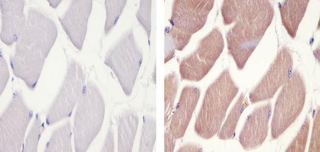- Immunohistochemistry analysis of Pannexin 2 showing staining in the cytoplasm of paraffin-embedded mouse skeletal muscle tissue (right) compared to a negative control without primary antibody (left). To expose target proteins, antigen retrieval was performed using 10mM sodium citrate (pH 6.0), microwaved for 8-15 min. Following antigen retrieval, tissues were blocked in 3% H2O2-methanol for 15 min at room temperature, washed with ddH2O and PBS, and then probed with a Anti- Pannexin 2 Polyclonal Antibody (Product # 42-2900) diluted in 3% BSA-PBS at a dilution of 1:20 overnight at 4ºC in a humidified chamber. Tissues were washed extensively in PBST and detection was performed using an HRP-conjugated secondary antibody followed by colorimetric detection using a DAB kit. Tissues were counterstained with hematoxylin and dehydrated with ethanol and xylene to prep for mounting.