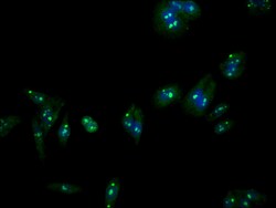 - Immunofluorescent analysis of Lass5 in HepG2 cells using a Lass5 polyclonal antibody (Product # PA5-98731) at a dilution of 1:100. Alexa Fluor 488-congugated Goat Anti-Rabbit IgG(H+L) secondary antibody was used.