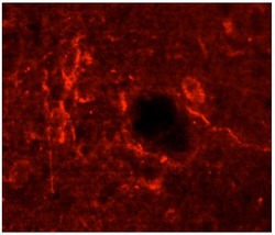 - Immunofluorescent detection of Bradykinin R2 in Rat brain using Cy3 conjugated anti-rabbit secondary antibodies (red fluorescence).