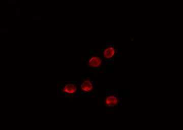 - Immunofluorescent analysis of MED26 in LOVO cells. Samples were fixed with paraformaldehyde, permeabilized with 0.1% Triton X-100, blocked with 10% serum (45 min at 25°C) incubated with MED26 polyclonal antibody (Product # PA5-101078) using a dilution of 1:200 (1 hr, 37°C), and followed by goat anti-rabbit IgG Alexa Fluor 594 at a dilution of 1:600.
