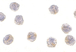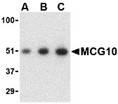 - Western blot analysis of MCG10 in HeLa cell lysate with MCG10 antibody at (A) 0.5