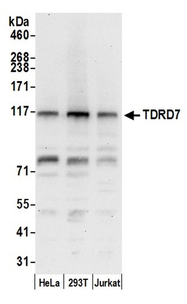 - Detection of human TDRD7 by western blot. Samples: Whole cell lysate (50 µg) from HeLa, 293T, and Jurkat cells prepared using NETN lysis buffer. Antibody: Affinity purified rabbit anti-TDRD7 antibody A305-126A-M (lot A305-126A-M-1) used for WB at 1:1000. Detection: Chemiluminescence with an exposure time of 30 seconds.