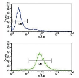 - BCL6 antibody flow cytometry analysis of Jurkat cells (bottom histogram) compared to a negative control (top histogram). FITC-conjugated goat-anti-rabbit secondary Ab was used for the analysis.