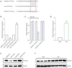 - Figure 5 COL22A1 is the target of miR-149-5p in HL-1 cells. (A) The predictive binding sequences between miR-149-5p and COL22A1. (B,C) The qRT-PCR and western blot assays showed that the overexpression of miR-149-5p significantly suppressed COL22A1 gene and protein expression, while the inhibition of miR-149-5p resulted in the upregulation of COL22A1 both in gene and protein as compared to the miRNA mimics and inhibitor NCs; U6 and GAPDH were used as the respective internal controls for each. (D) Luciferase assays were applied to confirm the binding between miR-149-5p and the 3'-UTR of COL22A1. Luciferase activity was measured. (E,F) qRT-PCR and western blot assays were performed to examine the mRNA and protein expression of COL22A1 in the mouse hearts induced by ISO or control; GAPDH was used as the internal control. ## , P