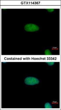 - Immunofluorescence analysis of paraformaldehyde-fixed HeLa, using DRIL1(GTX114367) antibody at 1:500 dilution.