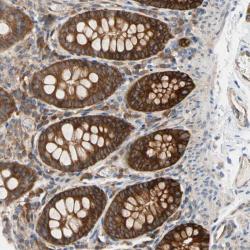 - Immunohistochemical staining of human colon shows strong cytoplasmic positivity in glandular cells.