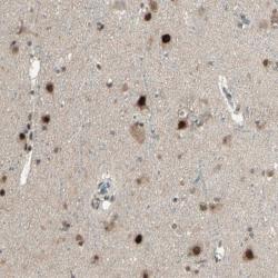 - Immunohistochemical staining of human cerebral cortex shows strong nuclear positivity in neuronal cells.
