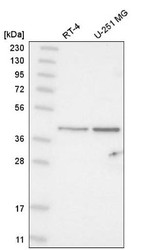 - Western Blot: ABHD11 Antibody [NBP1-87254] - Analysis in human cell line RT-4 and human cell line U-251 MG.