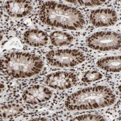 - Immunohistochemical staining of human colon shows strong nuclear positivity in glandular cells.