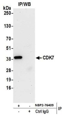 - Immunoprecipitation: Cdk7 Antibody (BL-80-5D4) [NBP2-76409] - Detection of human CDK7 by WB of immunoprecipitates from HeLa lysate. Antibodies: Rabbit anti-CDK7 recombinant monoclonal [BL-80-5D4] (NBP2-76409).