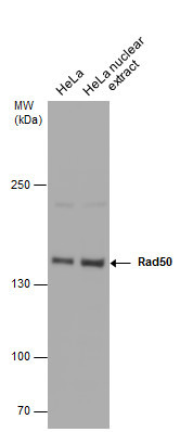 - HeLa whole cell and nuclear extracts (30 ?g) were separated by 5% SDS-PAGE, and the membrane was blotted with Rad50 antibody [N1N2], N-term (GTX119731) diluted at 1:500. The HRP-conjugated anti-rabbit IgG antibody (GTX213110-01) was used to detect the primary antibody.