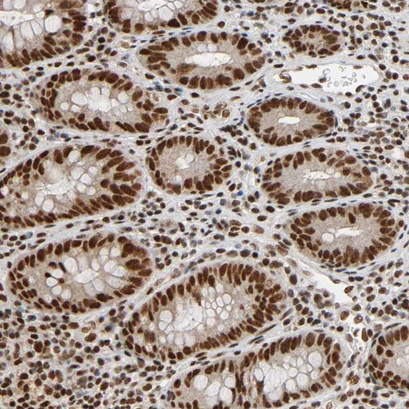 - Immunohistochemical staining of human colon shows strong nuclear positivity in glandular cells.