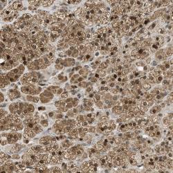 - Immunohistochemical staining of human adrenal gland shows moderate cytoplasmic and nuclear positivity in cortical cells.