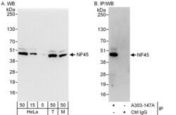 - Detection of human and mouse NF45 by western blot (h & m) and immunoprecipitation (h). Samples: Whole cell lysate from HeLa (5, 15 and 50 µg for WB; 1 mg for IP, 20% of IP loaded), 293T (T; 50 µg) and mouse NIH3T3 (M; 50 µg) cells. Antibodies: Affinity purified rabbit anti-NF45 antibody A303-147A used for WB at 0.1 µg/ml (A) and 1 µg/ml (B) and used for IP at 6 µg/mg lysate. Detection: Chemiluminescence with exposure times of 10 seconds (A and B).