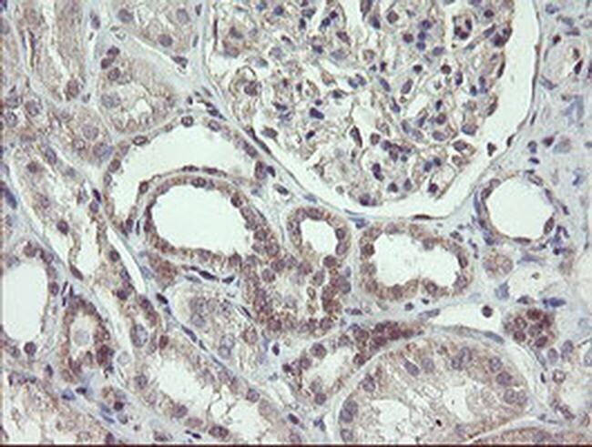- Immunohistochemical staining of paraffin-embedded human Kidney tissue within the normal limits using anti-FBXO42 mouse monoclonal antibody. (Heat-induced epitope retrieval by 10mM citric buffer, pH6.0, 100°C for 10min, TA800283)
