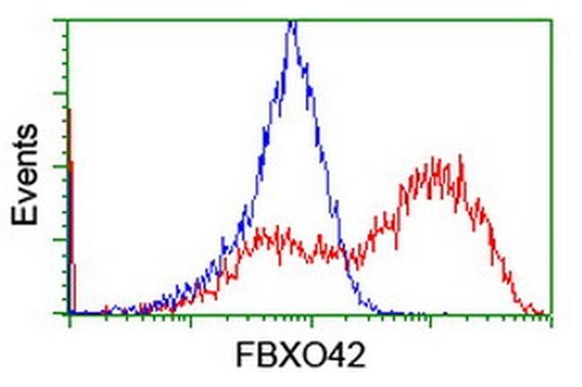 - HEK293T cells transfected with either RC209600 overexpress plasmid (Red) or empty vector control plasmid (Blue) were immunostained by anti-FBXO42 antibody (TA800283), and then analyzed by flow cytometry.