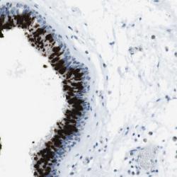 - Immunohistochemical staining of human nasopharynx shows strong cytoplasmic positivity in respiratory epithelial cells.