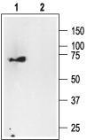 - Western blot analysis of rat brain membranes: 1. Anti-Human p75 NTR (intracellular) antibody, (1:200). 2. Anti-Human p75 NTR (intracellular) antibody, preincubated with the control peptide antigen.
