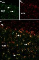 - Expression of p75NTR in mouse hippocampus. A. Mouse hippocampal sections (frozen) were stained with Anti-Human p75NTR-intracellular antibody(1:200). p75NTR (green) appeared in a subset of astrocytes. B. Astrocytes were visualized with Anti-glial fibrillary acidic protein (GFAP) antibody (red). C. A merge of the two images demonstrates appearance of p75NTR mainly in stratum radiatum (SOR) and only in a few astrocytes in the alveus (AL).