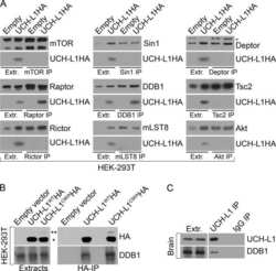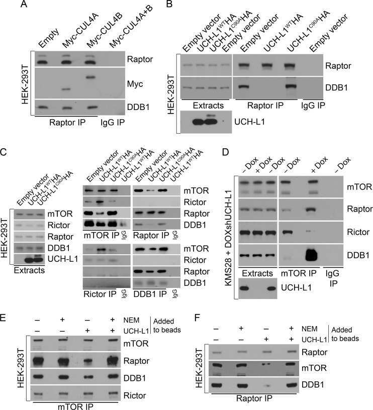 Ubiquitin hydrolase UCH-L1 destabilizes mTOR complex 1 by antagonizing DDB1-CUL4-mediated ubiquitination of raptor.