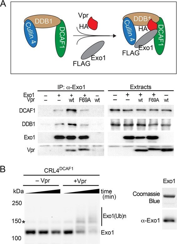 - FIG 4 Vpr recruits Exo1 to the CRL4 DCAF1 E3 for ubiquitination. (A) Vpr connects Exo1 to the endogenously expressed DDB1-DCAF1 module of the CRL4 DCAF1 E3 complex in vivo . (Top) Schematic representation of Vpr-mediated recruitment of Exo1 to the CRL4 DCAF1 E3 complex. The placement of HA and FLAG epitope tags on Vpr and Exo1, respectively, is indicated. (Bottom) FLAG-Exo1 was transiently coexpressed with HA-tagged wild-type HIV-1 Vpr (wt) or Vpr(F69A), which does not bind DCAF1, in HEK293T cells, as indicated. Endogenous DCAF1, DDB1, and ectopic Vpr and Exo1 were revealed in Exo1 immune complexes and in detergent extracts by immunoblotting. (B) Vpr-dependent Exo1 ubiquitination by recombinant CRL4 DCAF1 E3 in vitro . (Left) In vitro ubiquitination assays were performed with recombinant Exo1 incubated with CRL4 DCAF1c E3 reconstituted from recombinant subunits, in the absence or presence of recombinant HIV-1 NL4-3 Vpr. Reactions were sampled over time, and native (Exo1) and ubiquitinated [Exo1(Ub)n] forms of Exo1 were revealed by immunoblotting with alpha-Exo1 antibody. An asterisk indicates a nonspecific band. (Right) Recombinant Exo1 expressed and purified from E. coli was analyzed by SDS-PAGE, gel stained with Coomassie blue (upper), and confirmed by immunoblotting with alpha-Exo1 antibody.