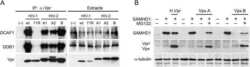 - Figure 1 Conserved amino acid residues in Vpx C-terminal region mediate the association with DDA1-DDB1-VprBP complex. (A) hfa-tagged wild type (lane 2) or mutant (lanes 3-6) Vpx proteins were transiently expressed in HEK 293T cells and precipitated from detergent extracts with FLAG-M2 affinity resin. DDB1, VprBP, DDA1 and hfa-Vpx were detected in immune complexes (left panel) and cell extracts (right panel) by immunoblotting and visualized by enhanced chemiluminescence. (B) Amino acid sequences of the C-terminal regions of SIVmac 239 Vpx, SIVmac 239 Vpr, and HIV-1 NL43 Vpr are aligned and amino acid substitutions for the conserved residues in Vpx are indicated. Numbers indicate the positions of the first amino acid residue shown in each protein sequence. Dots identify amino acid identities and letters specify amino acids in the single-letter code.