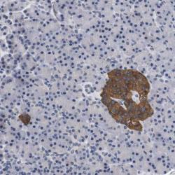 - Immunohistochemical staining of human pancreas shows strong cytoplasmic positivity in islet cells.