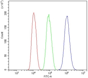- Flow cytometry testing of human HepG2 cells with TET1 antibody at 1ug/million cells (blocked with goat sera); Red=cells alone, Green=isotype control, Blue= TET1 antibody.