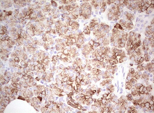 - Immunohistochemical staining of paraffin-embedded human pancreas tissue within the normal limits using anti-Acidic Cytokeratin mouse monoclonal antibody. (Heat-induced epitope retrieval by Tris-EDTA, pH8.0, TA190295)