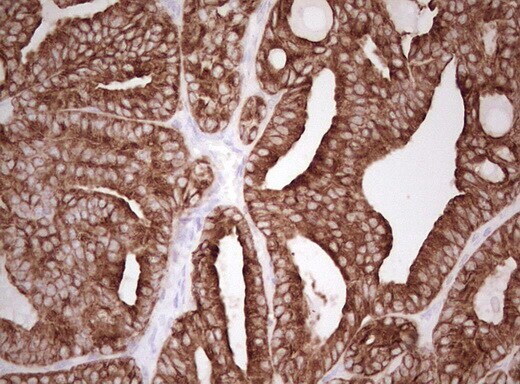 - Immunohistochemical staining of paraffin-embedded Carcinoma of Human thyroid tissue using anti-Acidic Cytokeratin mouse monoclonal antibody. (Heat-induced epitope retrieval by Tris-EDTA, pH8.0, TA190295)