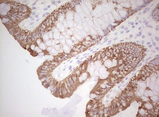 - Immunohistochemical staining of paraffin-embedded human colon tissue within the normal limits using anti-Acidic Cytokeratin mouse monoclonal antibody. (Heat-induced epitope retrieval by Tris-EDTA, pH8.0, TA190295)