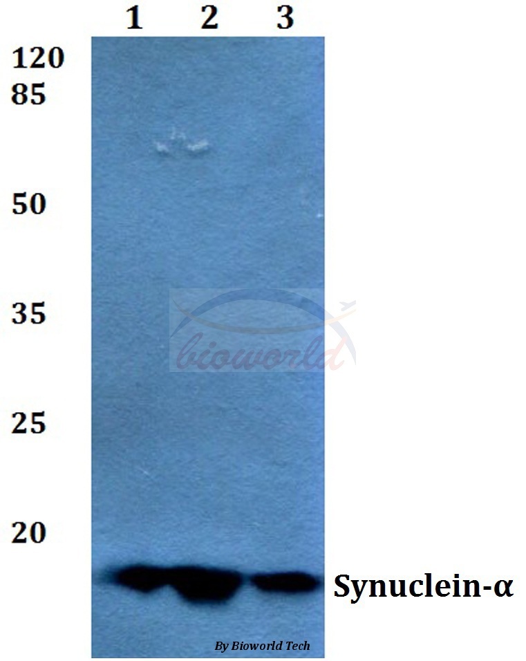 - Western blot (WB) analysis of Synuclein-¦Á (E123) pAb at 1:500 dilutionLane1:A549 whole cell lysateLane2:Mouse brain tissue lysateLane3:Rat brain tissue lysate