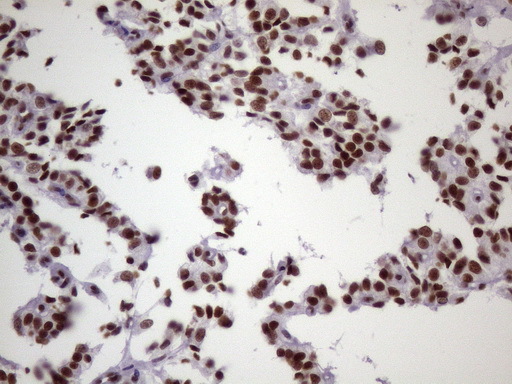 - Immunohistochemical staining of paraffin-embedded Carcinoma of Human lung tissue using anti-NUDT21 mouse monoclonal antibody. (Heat-induced epitope retrieval by 1 mM EDTA in 10mM Tris, pH8.5, 120C for 3min, TA806779)(1:150)