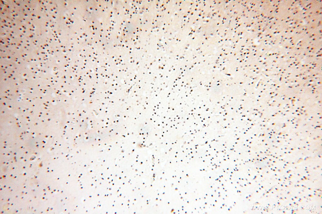 - Immunohistochemistry of paraffin-embedded human brain using 10322-1-AP (NUDT21 antibody) at dilution of 1:100 (under 10x lens).