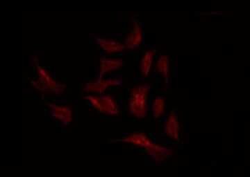 - Immunofluorescent analysis of SLC44A1 in K562. Samples were fixed with paraformaldehyde, permeabilized with 0.1% Triton X-100, blocked with 10% serum (45 min at 25°C) incubated with SLC44A1 polyclonal antibody (Product # PA5-102034) using a dilution of 1:200 (1 hr, 37°C), and followed by goat anti-rabbit IgG Alexa Fluor 594 at a dilution of 1:600.