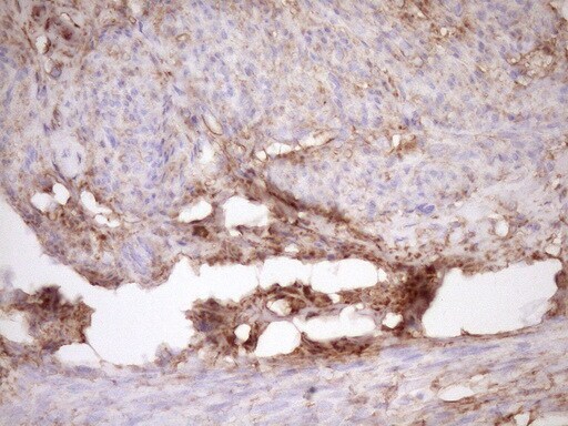 - Immunohistochemical staining of paraffin-embedded human Ovary tissue within the normal limits using anti-FSCN1 mouse monoclonal antibody. (Heat-induced epitope retrieval by Tris-EDTA, pH8.0, TA807293)(1:150)