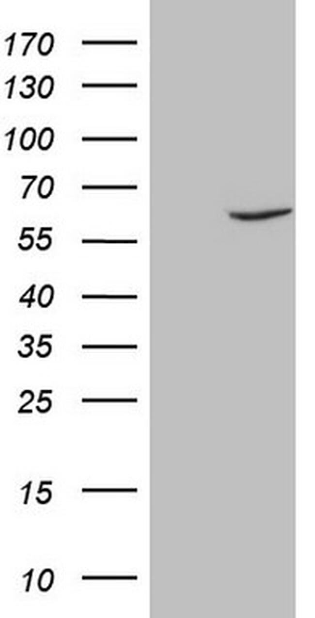 - HEK293T cells were transfected with the pCMV6-ENTRY control (Left lane) or pCMV6-ENTRY FSCN1 (RC203031, Right lane) cDNA for 48 hrs and lysed. Equivalent amounts of cell lysates (5 µg per lane) were separated by SDS-PAGE and immunoblotted with anti-FSCN1. Positive lysates LY401076 (100 µg) and LC401076 (20 µg) can be purchased separately from OriGene.
